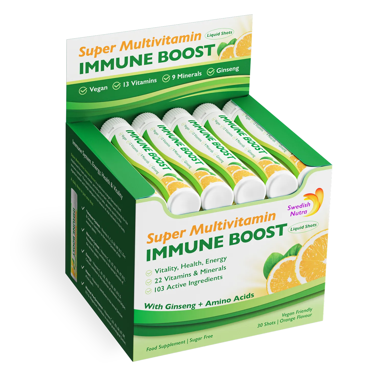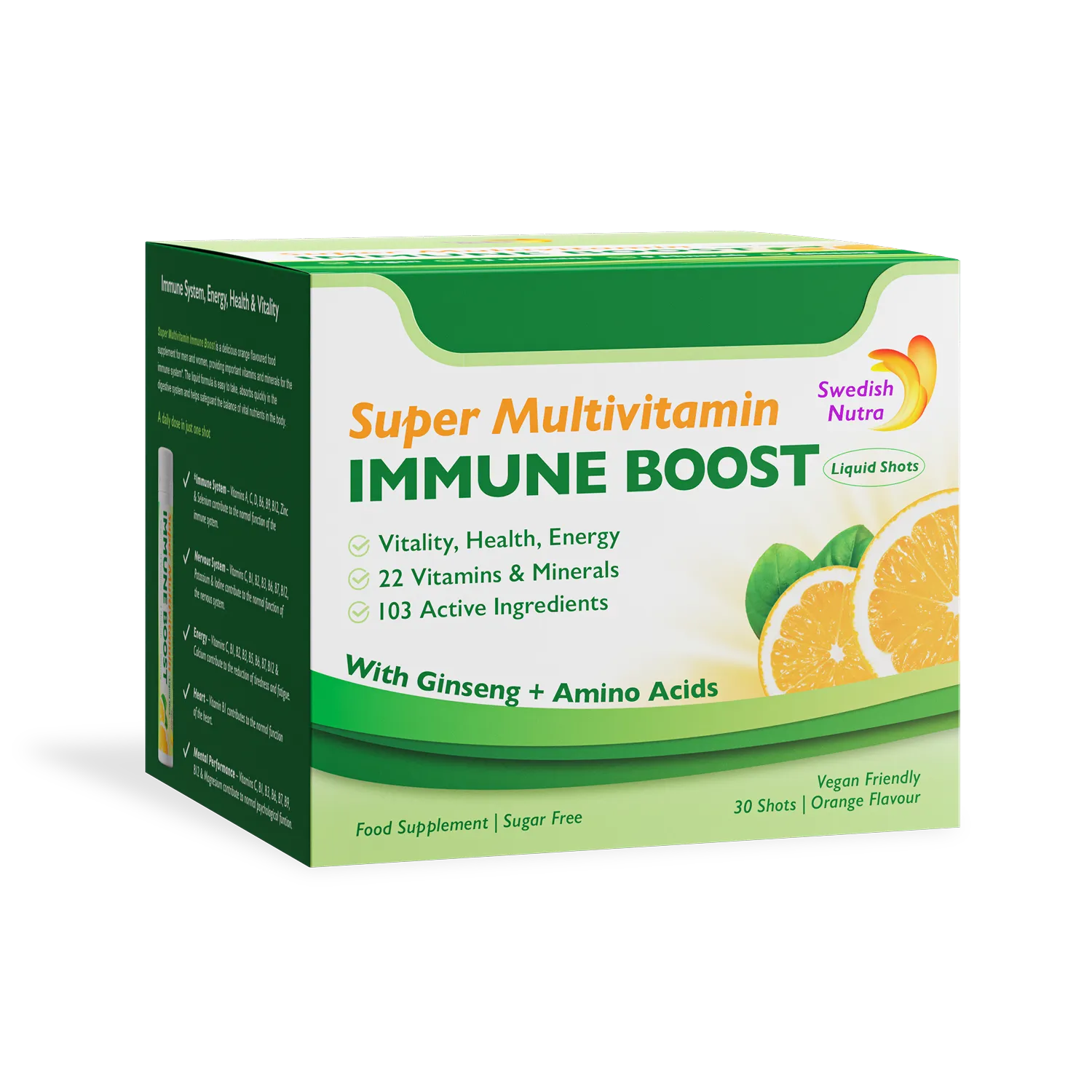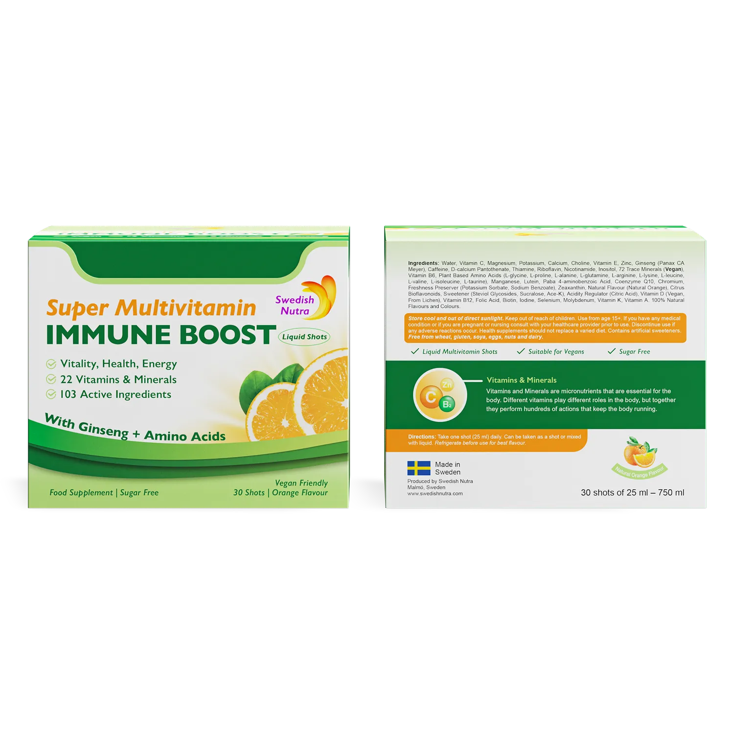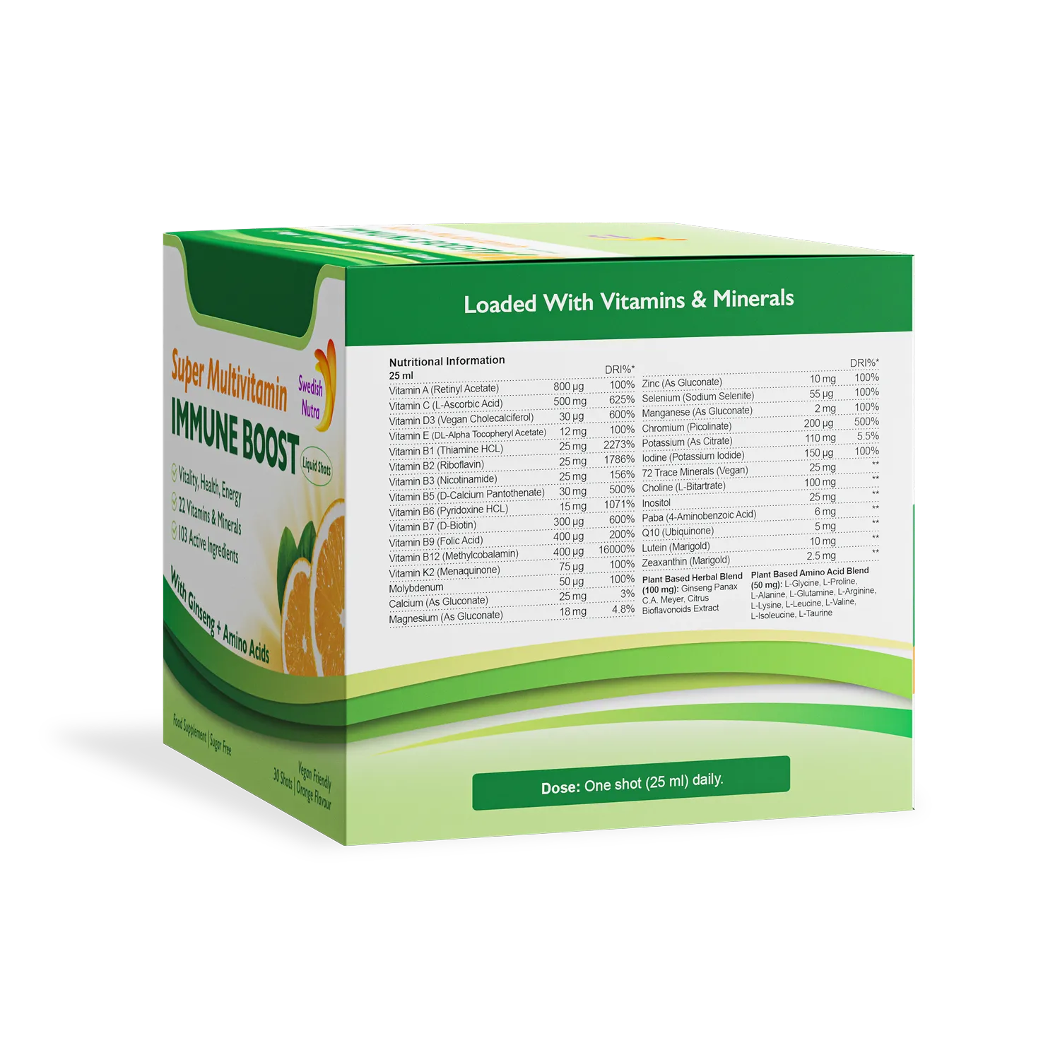 Fuel your body’s defenses with our Super Multivitamin Immune Boost. Packed with 27 active ingredients, this powerful formula provides comprehensive daily nutrition and immune support. Each 15 mL dose delivers: