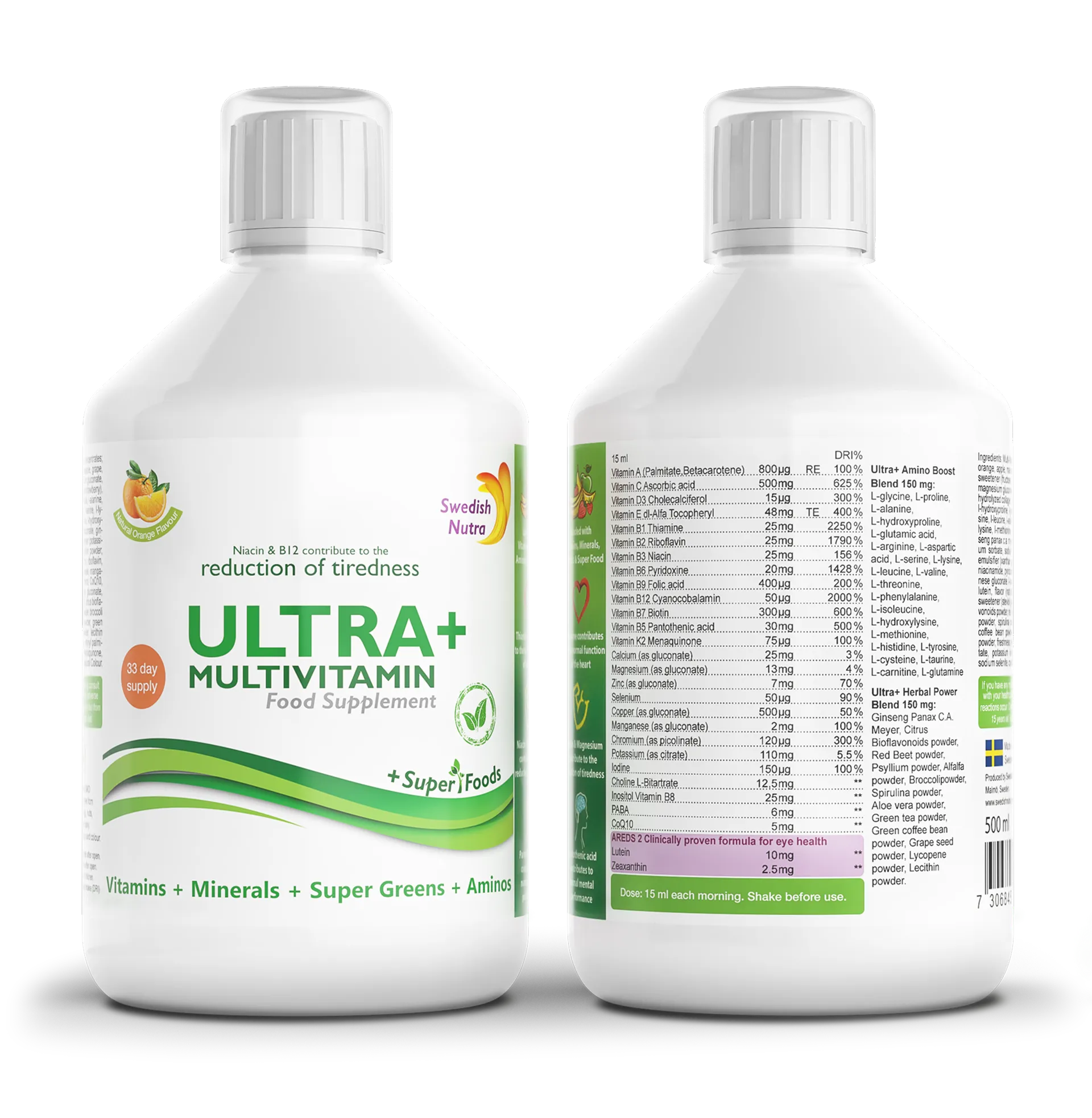 Fuel your daily performance with Ultra+ Multivitamin, a comprehensive liquid multivitamin formula enhanced with vitamins, minerals, amino acids, and super greens. Scientifically crafted to support energy, reduce tiredness, and promote overall vitality.